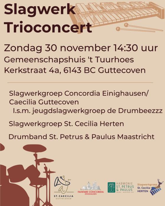 Op 30 november ontvangt de slagwerkgroep de slagwerkgroepen/drumbands van Wolder (Maastricht) en Herten voor een wervelend trio-concert in ’t Tuurhoes en een middag vol slagwerkmuziek.